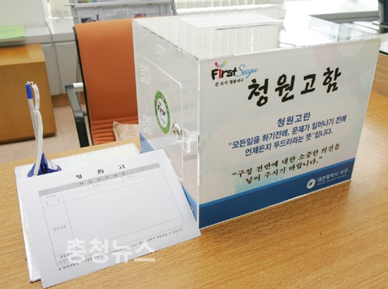 대전시 서구(구청장 박환용)는 구정 전반에 대해 주민들과 상시 소통을 하기 위해 구 홈페이지에 "청원고(請願告)"를 개설, 구청민원실과 23개 주민센터에는 청원고함을 제작 비치해 21일부터 연중 운영한다고 밝혔다.