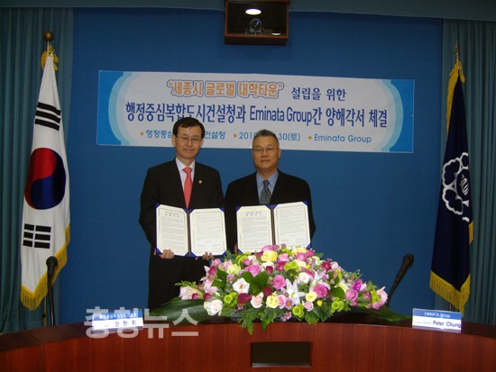 행정중심복합도시건설청(청장 한만희)은 “세종시 글로벌 대학타운” 설립을 위해 캐나다 뱅쿠버 소재 사학재단인 에미나타 그룹(Eminata Group)과 10월30일(토) 양해각서를 체결했다고 밝혔다.