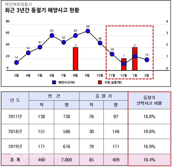 태안해경은 최근 3년간 관내 해양조난사고 분석결과 전체 460척, 2천명 중 동절기 해당사고는 85척, 409명으로 18.4%에 달했고, 관련 사망·실종자 수도 전체 5명 가운데 3명, 60%를 차지해 동절기 해양조난사고 예방대응 안전관리 필요성이 높은 것으로 나타났다.