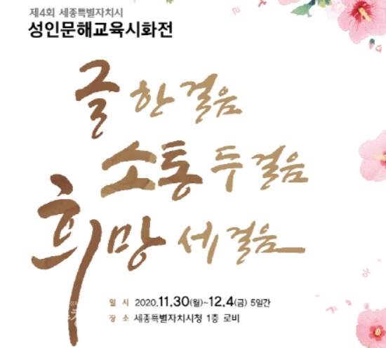세종특별자치시(시장 이춘희)가 문해교육 학습자들의 성과를 격려하기 위해 30일부터 내달 4일까지 청사 1층 로비에서 성인문해교육 시화전을 개최한다.