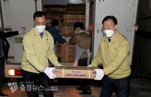 설동호 교육감을 비롯한 교육청 직원들은 수능 문답지를 보관 장소로 안전하게 운반했다.