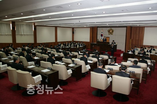 충남도의회(의장 유병기)는 16일 도의회 본회의장에서 제239회 정례회 제1차 본회의를 열고 내년도 예산심의를 위한 예산결산 특별위원회위원을 선임하고 안희정 지사와 김종성 교육감으로부터 내년도 예산안 편성에 대한 제안설명을 들었다.