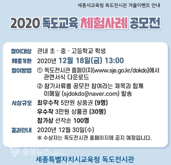 세종시교육청 독도전시관은 독도에 대한 역사의식 바로 알기와 독도의 이해도와 의미를 되새기고자 ‘2020 독도교육 체험사례 공모전’이 개최된다.