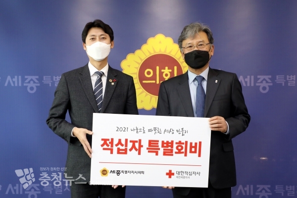 세종특별자치시의회(의장 이태환)는 15일 의장실에서 세종시사회복지공동모금회와 대한적십자사 대전‧세종지사에 각각 성금과 특별회비 100만원을 기탁했다.