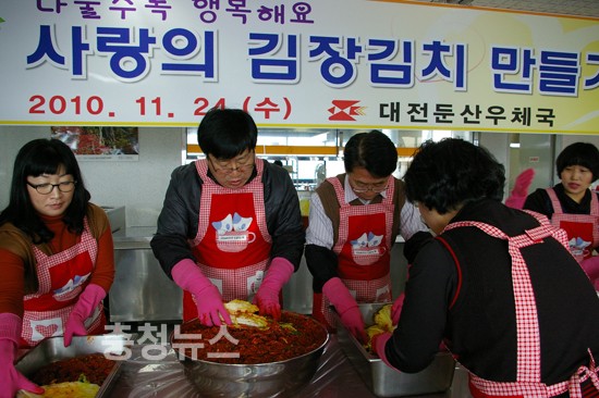 대전둔산우체국(국장 이완직)은지난 24일 우체국 구내식당에서 어려운 이웃을 위한 사랑의 김장김치 나누기 행사를 실시했다.