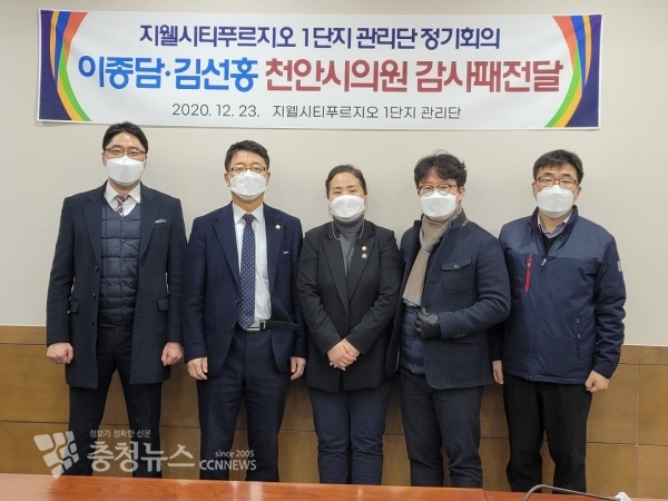 천안시의회 이종담 의원(불당동)은 23일 천안시 의회 회의실에서 천안시 불당동 지웰시티푸르지오 1단지 오피스텔 단지관리위원회(위원장 가영복)으로 부터 감사패를 받았다.