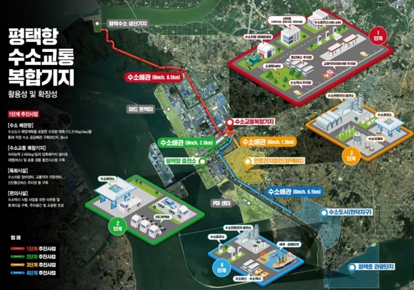 단계적으로 국비 포함 총 160억원 투입예정인 이번사업은 평택항 인근에 위치한 포승산업단지 내에 수소교통 복합기지를 구축할 예정이며, 수소충전소를 중심으로 주차장, 수소차량 경정비센터를 구축하여 평택시 수소 모빌리티 보급계획에 따라 '22년부터 수소 승용차·버스·교통약자 지원차량·트럭 등 수소차 1000여대에 수소연료를 공급한다는 계획이다.