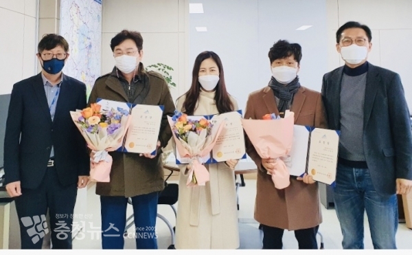 좌로부터 박형민 국장, 최주운 조치원 상인회장, 조원익 세종시교육청장학사, 김순자 청보리 캘리디자인연구소 대표, 김회산 기업지원과장