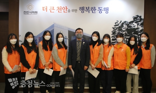 천안시의회(의장 황천순)에 북일여고 10여명의 학생으로 구성된 한화생명 해피프렌즈 하람셀이 새해를 맞아 황천순 의장에게 감사인사를 전하고자 5일 방문하였다.