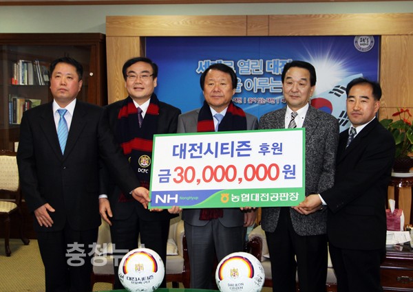 대전시는 13일 오전 10시 시청 응접실에서 염홍철 대전광역시장, 농협대전공판장 관계자 등이 참석한 가운데 '대전시티즌 후원금 기탁식'을 가졌다.