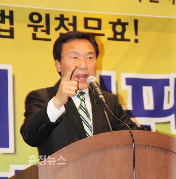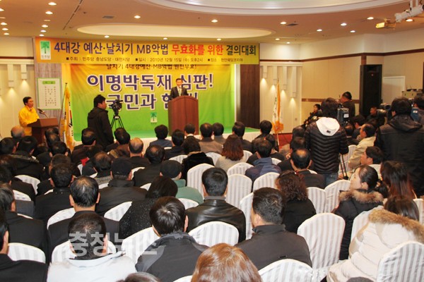 민주당 충남도당과 대전시당은 15일 오후 2시 천안 웨딩코리아에서 한나라당이 일방적으로 통과시킨 날치기 예산안 및 법안 무효화를 위한 규탄대회를 합동 개최했다.