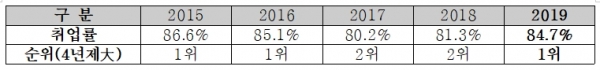 이번에 발표된 취업률은 2019년 12월 31일 기준 취업률(2018년 8월 졸업자 및 2019년 2월 졸업자 대상)이며, 교육부와 한국교육개발원이 국민건강보험공단, 국세청 등 공공 데이터베이스를 바탕으로 취업률을 조사해 대학 알리미에 공시한 결과다.