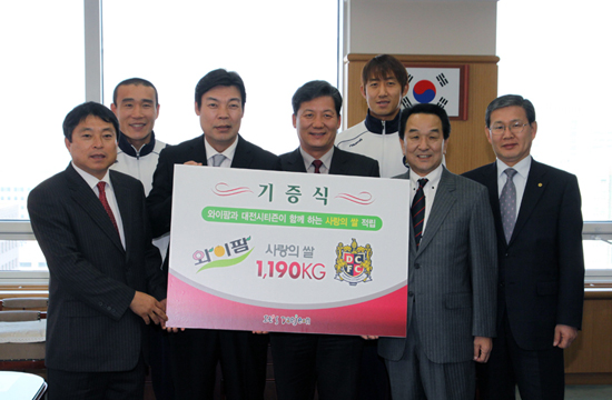 대전시티즌이 와이팜과 함께 적립한 사랑의 쌀 나눔행사를 17일 오후 2시 대전시청 정무부시장실에서 쌀 1,190kg을 대전 복지네트워크 복지만두레에 기탁했다.