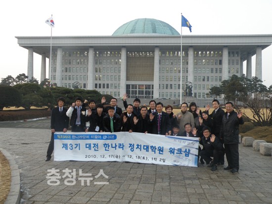 한나라당 대전시당(위원장 윤석만) 제3기 정치대학원 수강생들은 17일과 18일 양일간에 거쳐 청와대와 국회, 한나라당 중앙당을 방문하는 일정으로 정치대학원 워크숍을 개최했다.