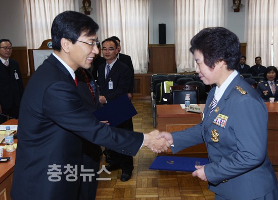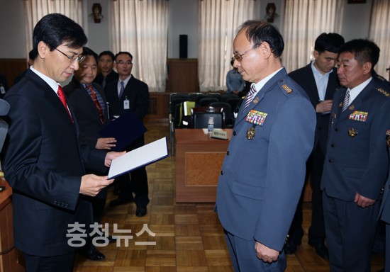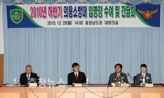 충남도(도지사 안희정)는 20일 오후 2시 도청 대강당에서 안희정 도지사 및 이현영 도 소방안전본부장, 황태성 도 의용소방대연합회장 등 110여명이 참석한 가운데 시․군 신임 의용소방대장 등에 임명장 수여식을 갖고'지역 재난 예방활동의 노고'를 격려 했다.