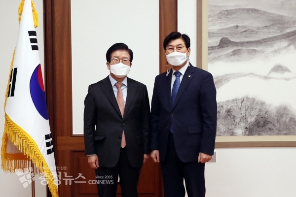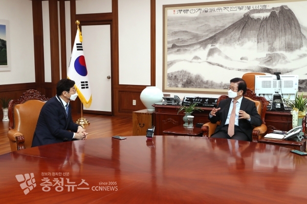 박병석 국회의장은 20일 오후 의장집무실에서 이춘희 세종특별자치시장의 예방을 받고, “올해 국회 세종의사당 설계가 발주되도록 할 것"이라고 밝혔다.