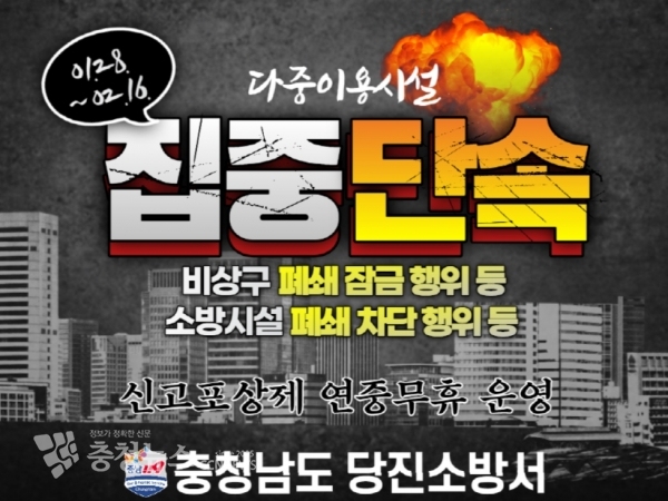 당진소방서(서장 유현근)는 겨울철 소방안전대책의 일환으로 오는 28일부터 2월 16일까지 20일간 다중이용시설의 비상구 등 소방시설 불법행위에 대한 불시 집중단속을 실시한다.