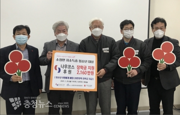 세종특별자치시 소정면에 위치한 화장품 업체 ㈜나우코스(대표 노향선)가 25일 나우코스 대회의실에서 청소년 장학금 전달식을 갖고 소정면 지역사회보장협의체에 장학금 2,160만 원을 쾌척했다.