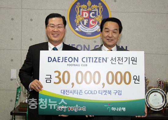 충청하나은행 박종덕 대표와 대전시티즌 김윤식 사장은  28일 오후 대전시티즌 사무국에서 3천만원어치의 티켓북 구매와 함께 티켓북 대행판매 등에 대해 약속했다.