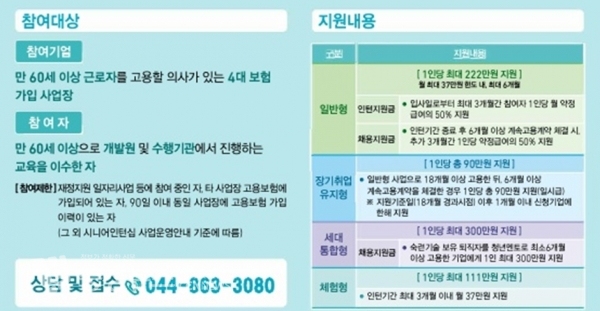 만 60세 이상을 채용하는 기업에 인건비를 지원하여 계속 고용 유도… 고령자 소득 보전 및 고용안정화 기여