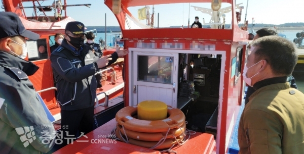 설 연휴 대비 낚시어선 특별점검 현장에 함께 나선 윤 태연 태안해경서장이 낚시어선 선장들과 의견을 듣고 나누며 치안현장 소통행보를 이어가고 있다. 출처=태안해양경찰서