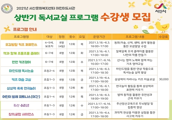 서산문화복지센터 어린이도서관(이하 서산어린이도서관)은 오는 24일부터 ‘2021년 상반기 독서교실 프로그램’ 수강생을 어린이도서관 홈페이지를 통해 모집한다.