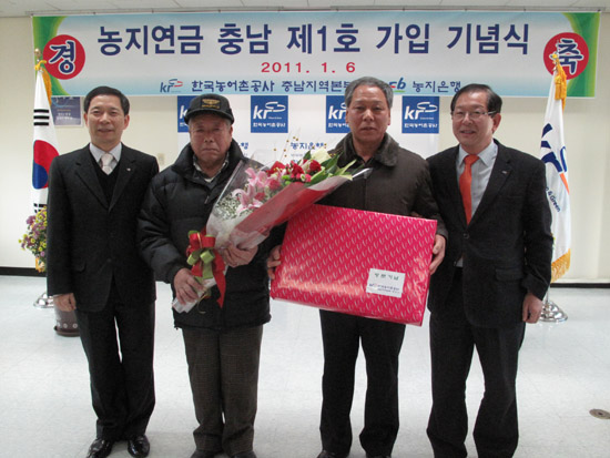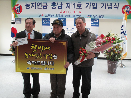 농지를 담보로 평생 연금을 받는 농지연금제도가 2011년 1월 1일 본격 실시된 가운데 충남지역에서 6일 첫 농지연금 제1호 가입자가 탄생했다.