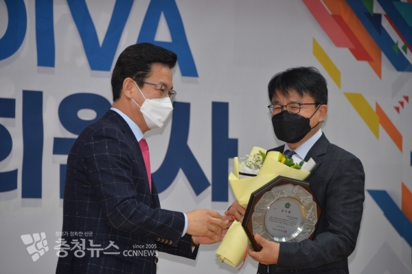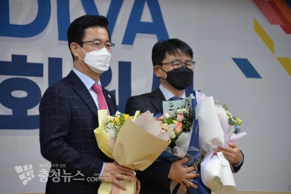 허태정 대전광역시장은 24일 대전테크노파크 어울림플라자 2층 대강당에서 열린 'DIVA 대덕 INNOPOLIS 벤처협회 회장 이·취임식'에서 이임하는 박찬구 회장에게 감사패를 수여했다.