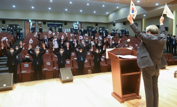 이날 기념식은 코로나19로 인한 사회적 거리두기를 고려해 독립유공자, 광복회 등 보훈단체 회원 및 시민 등 30여 명이 참석한 가운데 독립선언서 낭독, 기념사, 만세삼창 순으로 진행됐다.