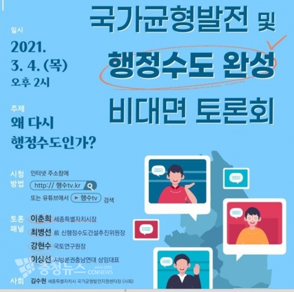 세종특별자치시 국가균형발전지원센터(센터장 김수현) 는 4일(목) 오후 2시부터 ‘“왜 다시 행정수도인가?”이란 주제로 비대면 토론회를 온라인 생중계로 개최한다.