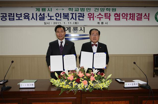 충청남도 계룡시(시장 이기원)는 11일 학교법인 건양학원과 공립보육시설(계룡상록어린이집)및 노인복지관 위탁관리 협약을 체결하고 본격적인 운영에 들어갔다.