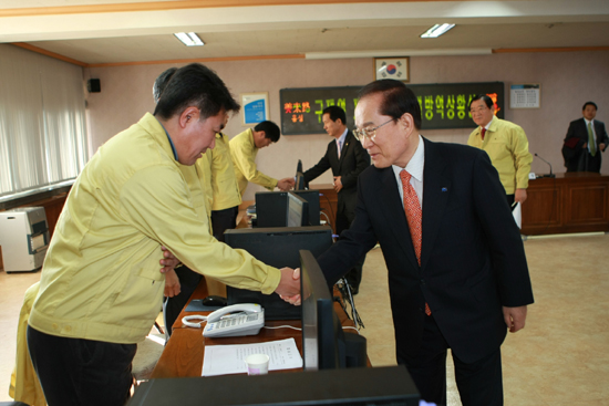 홍성지역 국회의원인 자유선진당 이회창 대표는 12일 오후 홍성군청 내에 설치된 구제역 합동상황실을 방문한데 이어 홍북면 중계리와 대인리에 설치된 방역초소를 각각 방문해 근무자를 격려했다.
