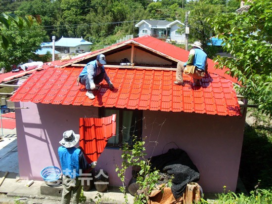 이번 나눔은 에스엔씨건설(주)에서 유해 슬레이트지붕 철거를 담당, 주신패널에서는 칼라강판 등 자재지원, (주)근원건설산업에서 시공인력지원, 청진노인회에서 싱크대를 설치하는 등 1,000여만원 상당을 지원, 지원가능한 각 분야별로 한마음 한뜻으로 나눔을 실천해 모범을 보였다는데 그 의미가 더욱 크다.