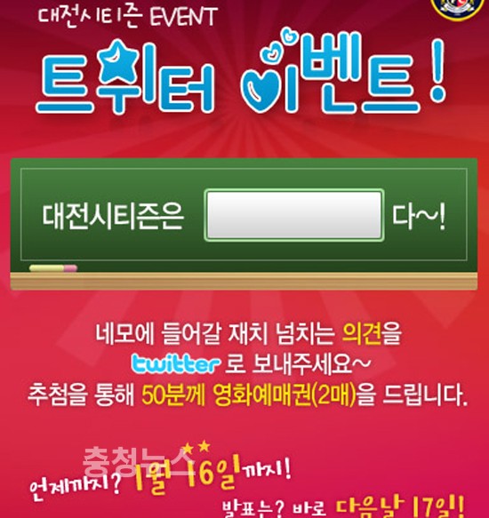 대전시티즌 트위터 이벤트는 누구나 참여할 수 있으며, 16일까지 참여한 사람 중 추첨을 통해 50명에게 영화예매권 2매를 선물한다.