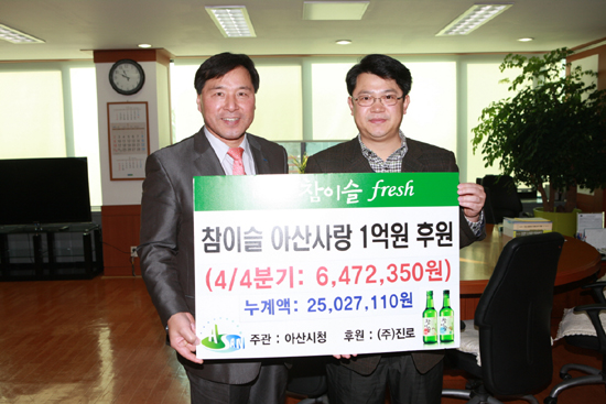 (주)진로 천안지점(지점장 장주호)은 지난 13일 아산시청에서 복기왕 아산시장에게 ‘참 이슬 아산사랑 1억원 후원사업’의 지난해 4분기 적립후원금 647만원 전달식을 가졌다.