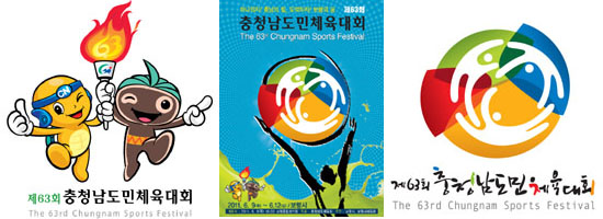 ▲ 제63회 충청남도민체육대회 마스코트, 포스터,마크(왼쪽부터)