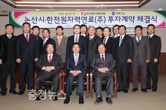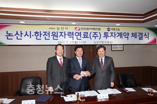 논산2일반산업단지를 개발하고 있는 계룡건설에 따르면, 17일 11시 논산시청에서 황명선 논산시장과 김기학 한전원자력연료 대표, 이시구 계룡건설 회장이 참석한 가운데 논산2일반산업단지 투자계약 서명식을 가졌다고 밝혔다.