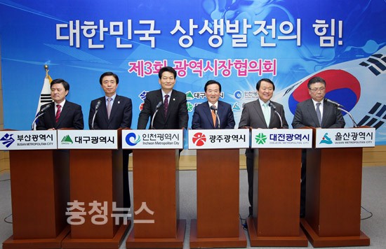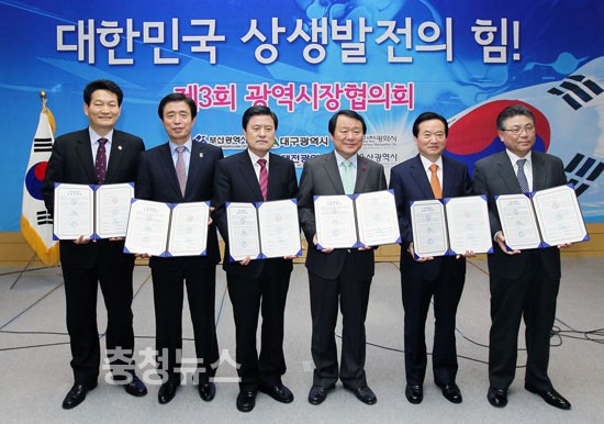 염홍철 대전시장을 비롯한 전국 6대 광역시장은 18일 오후 대전컨벤션센터에서 모임을 갖고 도시철도 운영 개선과 복지부분에 대한 정부의 역할 증대 등 13건의 대도시 현안에 대해 국가차원의 지원을 촉구하는 5개항의 공동건의문을 채택하고 이를 정부에 전달하기로 했다.