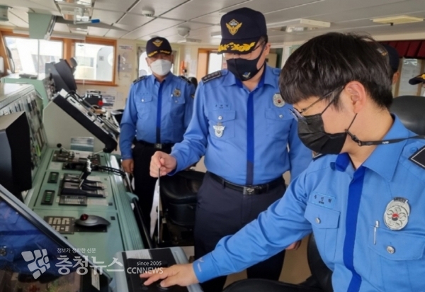 태안해양경찰서 윤태연 서장(오른쪽 2번째)이 1507함 조타실에서 항해장비 운영 및 관리실태를 직접 점검 확인하고 있다. / 출처=태안해양경찰서