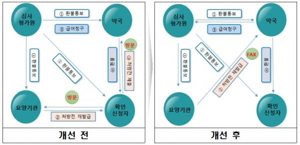 진료비확인 결과, 비급여 또는 전액본인부담금으로 지불한 원외처방 약제비가 환불 대상으로 결정된 경우, 그동안은 환자가 직접 의료기관을 방문해 변경된 원외처방전을 재발급 받아 약국에 전달하고 환불받는 절차로 운영되어 국민의 불편이 컸다.
