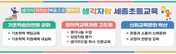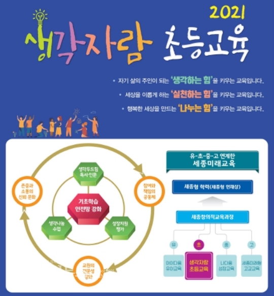 ‘생각자람 초등교육’은 주체적 삶의 기본인 자기 생각을 만들고 더 나아가 자기 생각이 자랄 수 있도록 돕는 세종 초등교육의 실현 의지를 담은 이름이다.