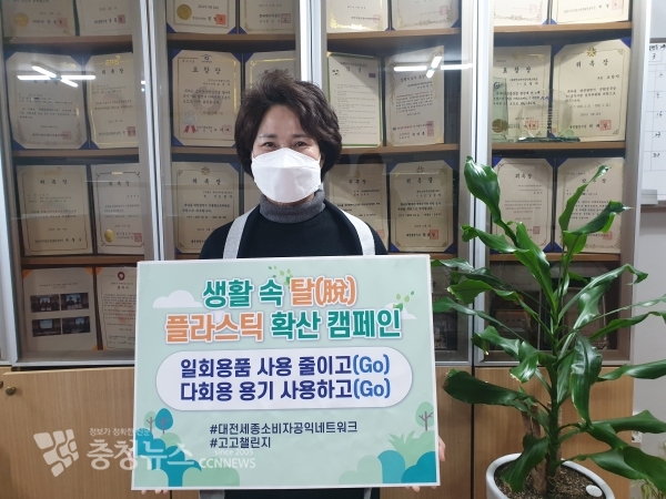도정자 대전세종소비자공익네트워크 회장이 생활속 탈(脫) 플라스틱 실천운동으로 실시하는 "고고 챌린지"에 윤혜숙 대전서구자원봉사센터장 으로부터 지목 받았다.