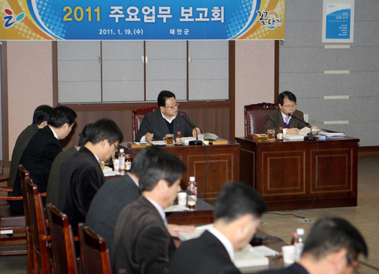 충남 태안군(군수 김세호)은 19일 군청 중회의실서 김세호 군수를 비롯한 간부 공무원 등 50여명이 참석한 가운데 ‘2011년 주요업무 추진계획 보고회’를 갖고 세계로 뻗어나가는 ‘으뜸 휴양도시 태안’을 만들어 나가겠다고 밝혔다.