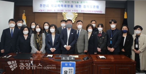 천안시의회(의장 황천순)는 19일 시의회 복지문화위원회 대회의실에서 ‘천안시 학교폭력예방을 위한 정책토론회’개최했다.