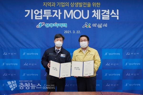 이어 “(주)성우하이텍의 신규 투자가 지역 인재채용, 지역 내 농수축산물 소비 촉진 등으로 이어져 지역경제 활성화로 이어지기를 바란다. 아산시도 ‘기업하기 좋은 아산 만들기’를 위해 행정력 지원을 아끼지 않겠다”고 말했다.