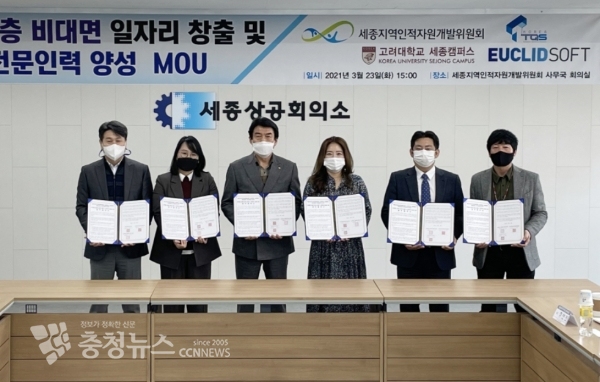 세종지역인적자원개발위원회(공동위원장 이두식, 조상호)는 23일(화) 오후 3시 세종상공회의소에서 고려대학교 세종캠퍼스 HRD 사업단, ㈜유클리드소프트, ㈜티큐에스코리아와 취약계층 비대면 일자리 창출 및 전문인력 양성을 위한 업무협약을 체결했다.