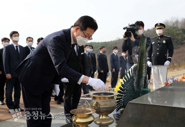 양승조 충남지사는 24일 연평해전 19주기 및 천안함 용사 11주기를 맞아 국립대전현충원을 방문, 연평해전 전사자 묘역과 천안함 46용사 묘역을 참배했다.