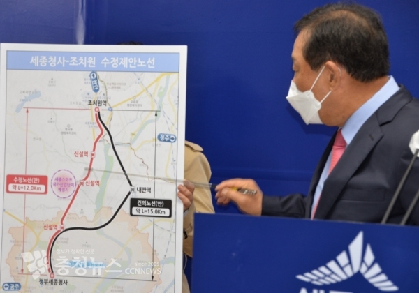 그러면서 "수정 노선안은 조치원-세종청사-대전을 지하철로 연결하는 약 12km의 노선으로 이동성을 높혀줄 뿐만 아니라, 세종시에서 추진 하는 1조 5000억원대 ‘세종스마트 국가산업단지’ 부근 등 2~3개의 정차역을 신설 하자는 것"이라고 강조했다.