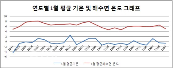▲ 연도별 1월 평균기온 및 해수면 수온 통계