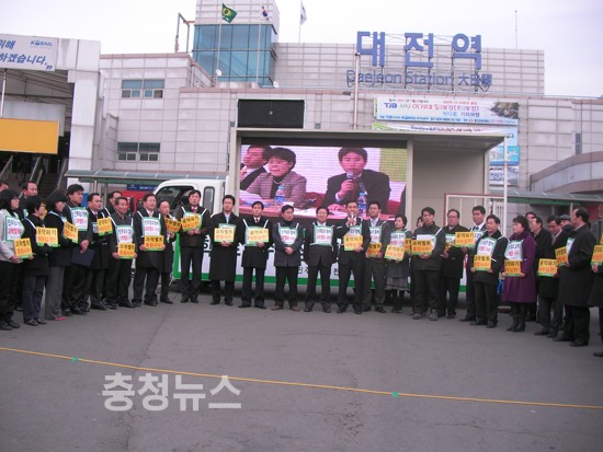 ▲ 대전역광장에서 과학벨트 충청권 입지를 촉구하는 규탄대회를 하는 민주당 대전시당 의원들